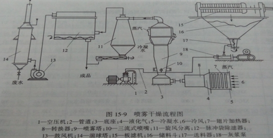 噴霧干燥器是一種適用范圍很廣的干燥器。它采用霧化器將料液分散為霧滴,并用熱風干燥霧滴而獲得產品的干燥技術。料液可以是溶液、懸浮液、乳濁液,也可以是熔融液或泥糊液。干燥產品可根據需要研制成粉狀、顆粒狀、團狀、和空心球狀。噴霧干燥的流程如圖所示。