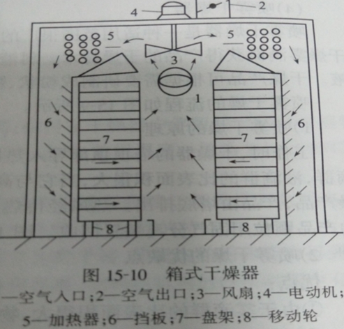 箱式干燥機主要是以熱風通過物料的表面而達到干燥的目的。它為間歇式操作,適用于干燥時間較長和數量不多的物料。通常物料裝盤用人工放入干燥器支架上,或置于小推車上送入箱內。物料的厚度為10~100nm,熱空氣的流速為0.5~10m/s。箱式干燥機結構如圖所示。