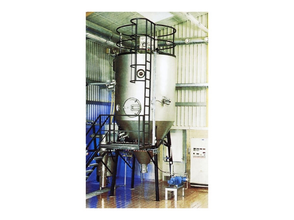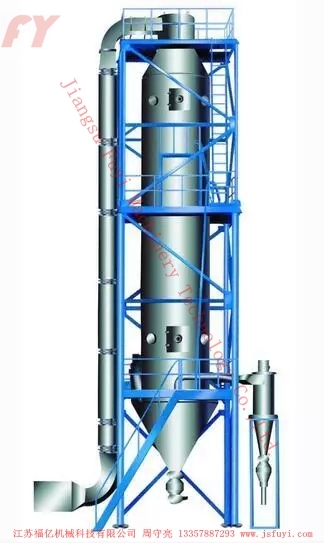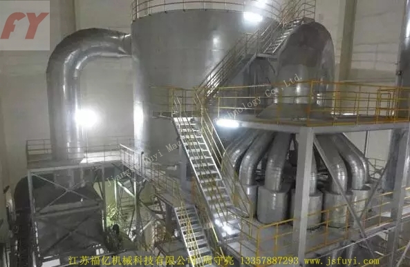 空氣經過濾和加熱,進入干燥器頂部空氣分配器,熱空氣呈螺旋狀均勻地進入干燥室。料液經塔體頂部的高速離心霧化器,(旋轉)噴霧成極細微的霧狀液珠,與熱空氣并流接觸在極短的時間內可干燥為成品。成品連續地由干燥塔底部和旋風分離器中輸出,廢氣由風機排空。