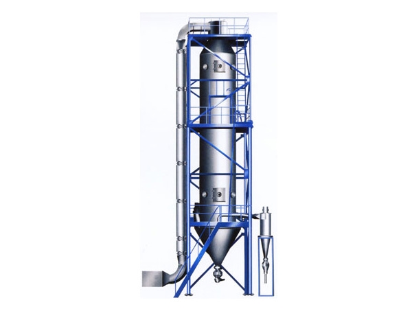 本機組工作過程為料液通過隔膜泵高壓輸入,噴出霧狀液滴,然后同熱空氣并流下降,大部分粉粒由塔底排料口收集,廢氣及其微小粉末經旋風分離器分離,廢氣由抽風機排出,粉末由設在旋風分離器下端的授粉筒收集,風機出口還可裝備二級除塵裝置,回收率在96-98%以上。