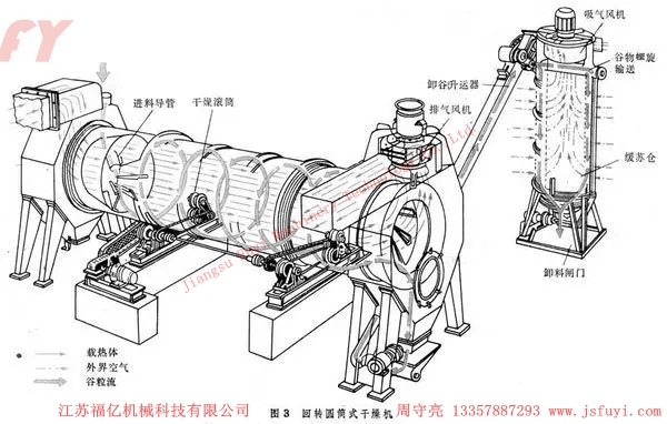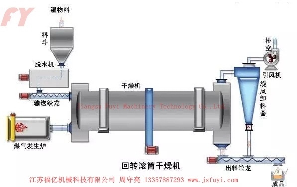 濕物料從干燥機一端投入后,在內筒均布的抄板器翻動下,物料在干燥器內均勻分布與分散,并與并流(逆流)的熱空氣充分接觸,加快了干燥傳熱,傳至推動力。在干燥過程中,物料在帶有傾斜度的抄板和熱氣流的作用下,可調控地運動至干燥機另一段星形卸料閥排出成品。