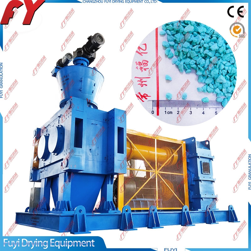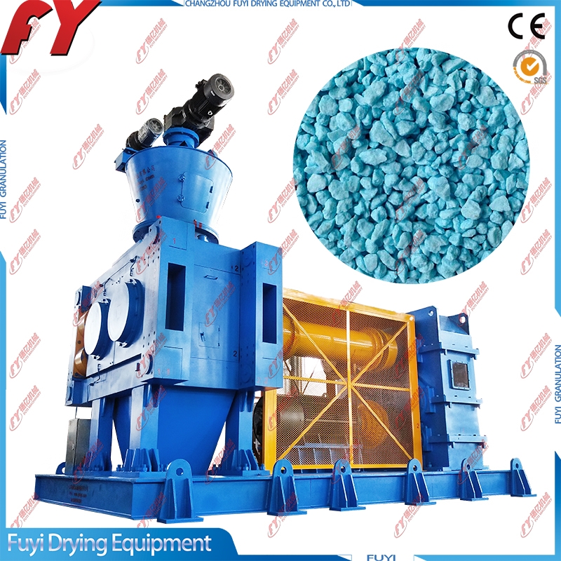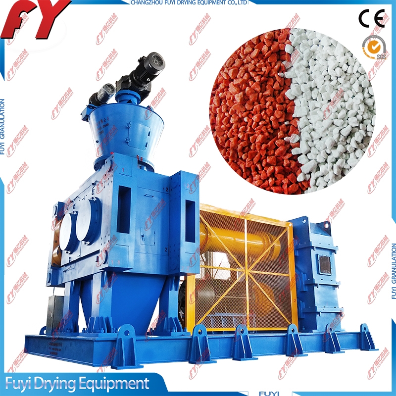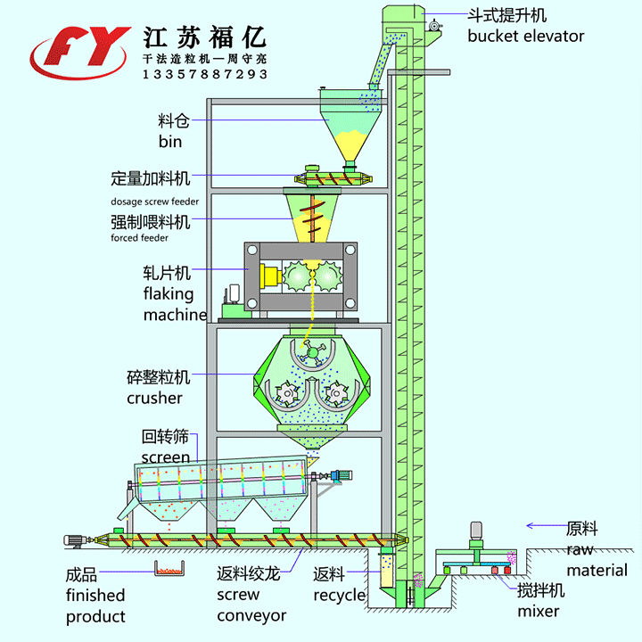 原料經定量加料器均勻送入喂料斗, 扎機利用帶有穴眼孔的成對軋輥,彼此留有一定間隙,兩者以相同的轉速作反向旋轉。其中一組軋輥軸承座在機架內不動,而另一組軋輥軸承座則在機架導軌上游動,借助液壓缸施壓使彼此緊靠。軋輥表面上有規則地排列許多形狀、大小相同的穴眼孔,且波谷對準波谷。而此時干粉狀物料從兩軋輥上方連續均勻地靠自重及強制喂料進入兩軋輥之間,物料先作自由流動,進入咬入區后被軋輥逐漸咬入波谷。隨著軋輥的連續旋轉,物料占有的空間逐漸減少而被逐步壓縮,并達到成型壓力^大值。隨后則壓力逐漸降低,所壓得之型塊因彈性回復加之自重而脫落穴眼孔而進入碎整粒、篩分裝置,所得成品為粒狀合格產品,進行過秤包裝。而粉料口出來的細粉料和不合格的超大顆粒則由返料絞龍重新進入提升機加料口隨同新鮮物料混合加入預加料斗而進入下一輪工藝流程。