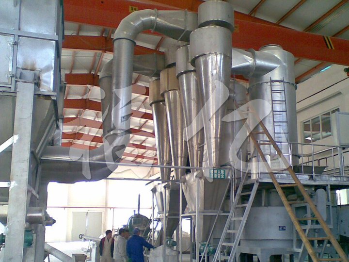 熱空氣由進風口以適宜的噴動速度從干燥機底部進入攪拌粉碎干燥室,對物料強烈的剪切、吹浮、旋轉作用,于是物料受到離心、剪切、碰撞、磨擦而被微粒化,強化了傳質傳熱。在干燥機底部,較大較濕顆粒團在攪拌器的作用下被機械破碎,濕含量較低、顆粒度較小的顆粒被旋轉氣流夾帶上升,在上升的過程中進一步干燥,由于氣固相作旋轉流動,固相慣性大于氣相,固氣兩相間的相對速度較大,強化兩相間的傳熱效果,所以該機干燥強度高。
